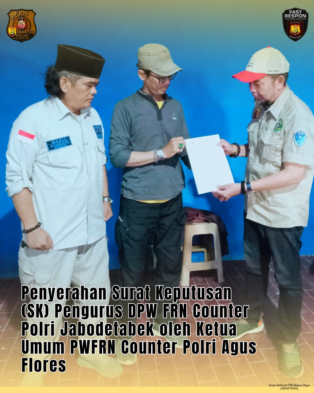 MDI.NEWS, BEKASI – Ketua Umum Perkumpulan Wartawan (PW) Fast Respon Nusantara (FRN) Counter Polri, Agus Flores, resmi menyerahkan Surat Keputusan (SK) kepengurusan kepada DPW FRN Counter Polri Jabodetabek dan DPC FRN Counter Polri Bekasi Raya dalam kunjungannya ke kantor baru FRN di Bekasi Raya, Jumat (1/8/2025).