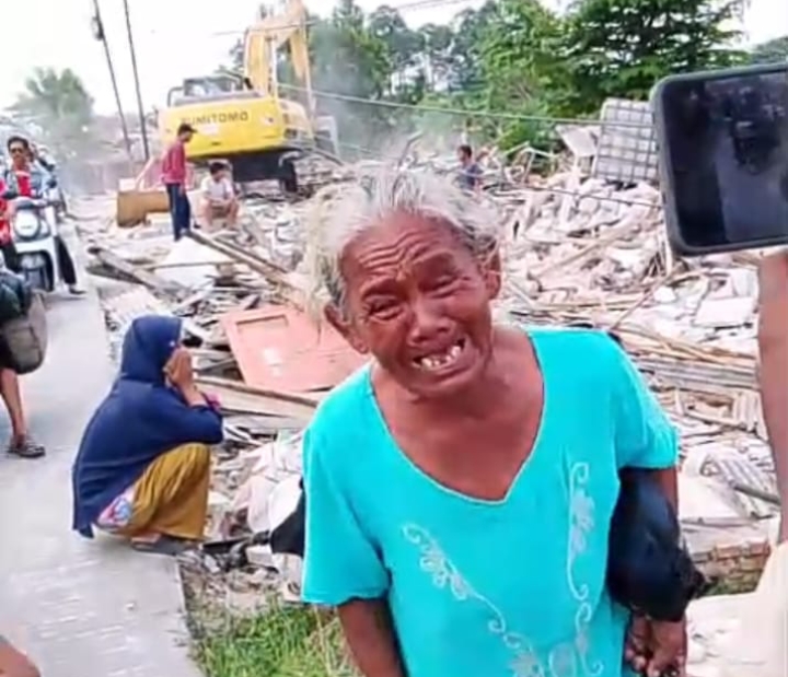 Seorang lansia perempuan tampak menangis saat melihat rumahnya dirobohkan. Ia mengaku bingung harus tinggal di mana setelah penggusuran dilakukan.