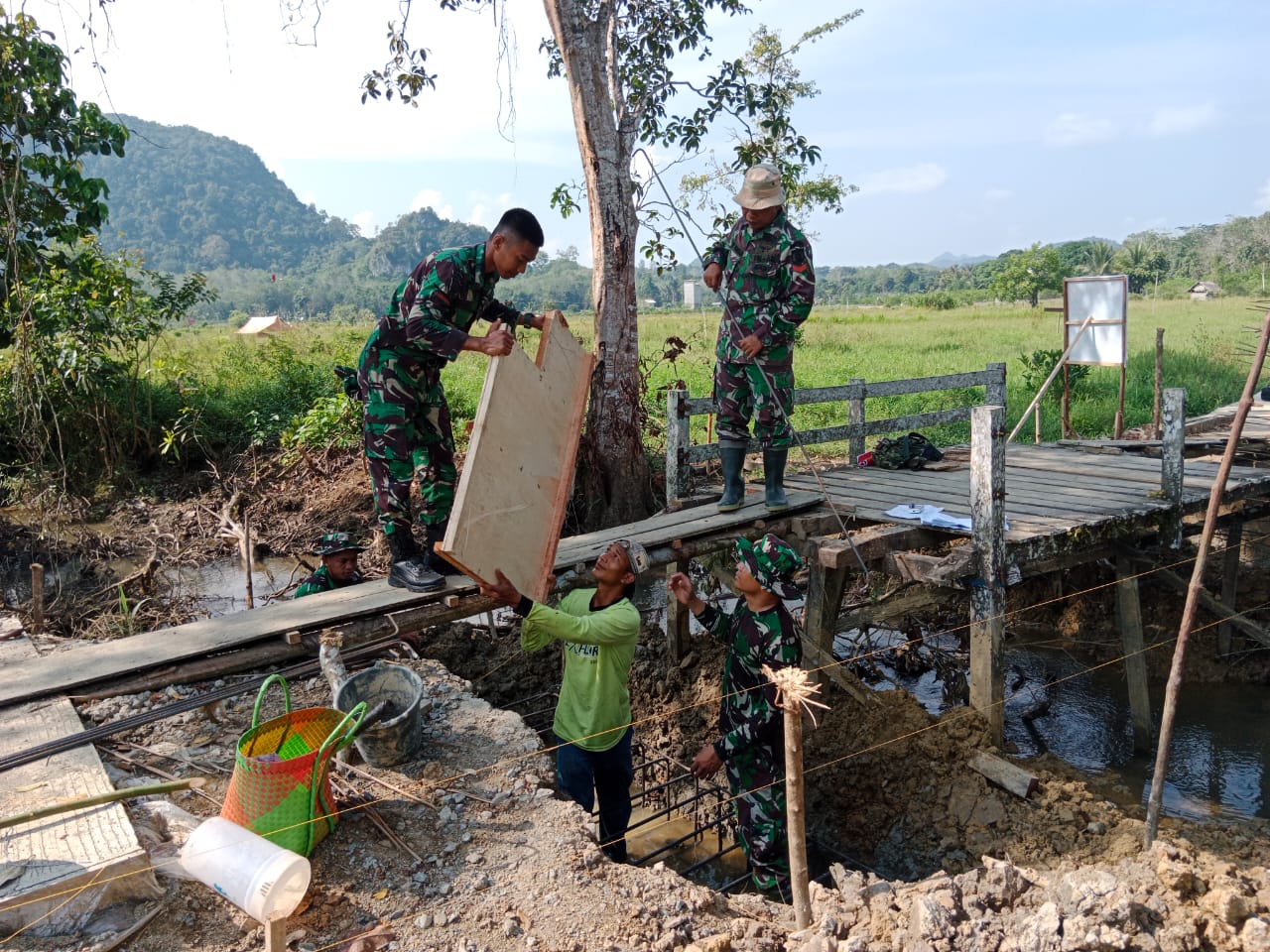 Anggota satgas TMMD dari satuan Zipur 8/GW Banjarbaru bersama warga masyarakat Hapulang mengerjakan abutment Jembatan.