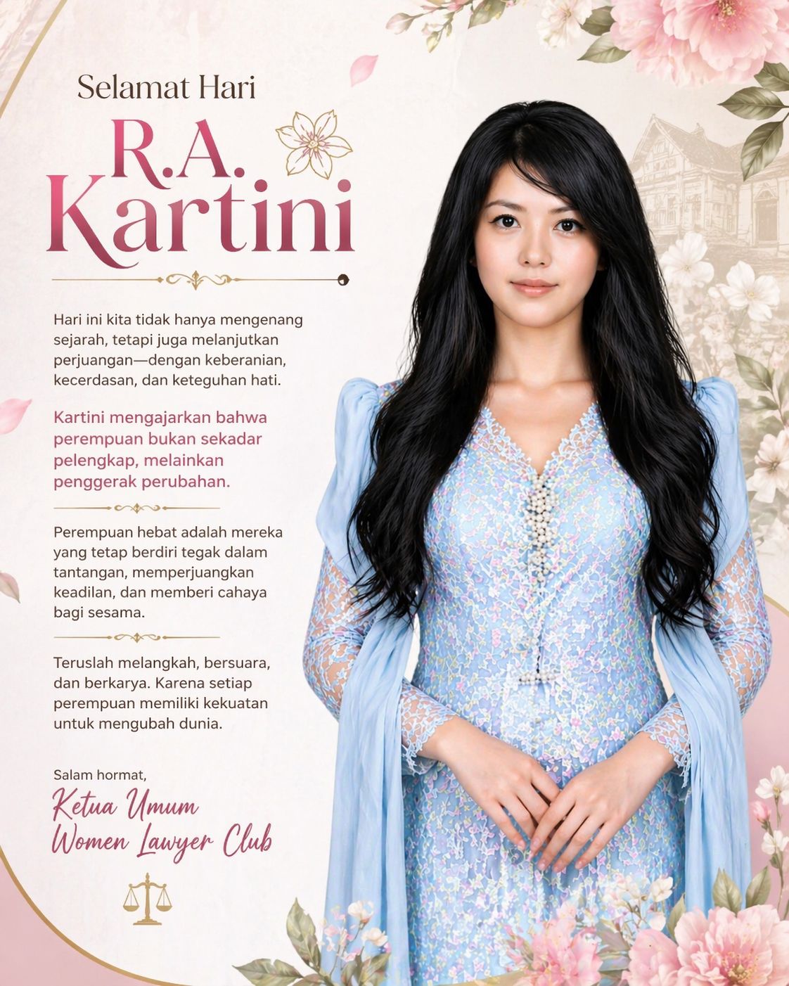 MDI.NEWS, Jakarta – Dalam rangka memperingati Hari Kartini yang jatuh pada Selasa, 21 April 2026, Ketua Umum Women Lawyer Club (WLC), Zulfah Adriani, S.H., M.H., menyampaikan pesan inspiratif kepada seluruh perempuan Indonesia.