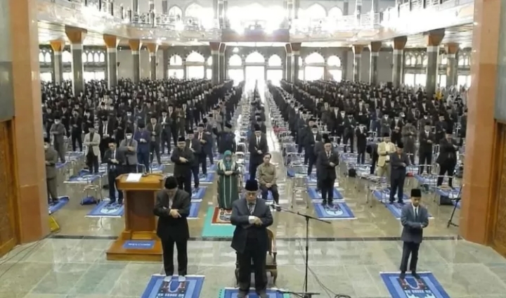 Di situ juga terlihat jarak antara jamaah satu dengan jammah lainnya renggang seperti saat salat di masa pandemi.