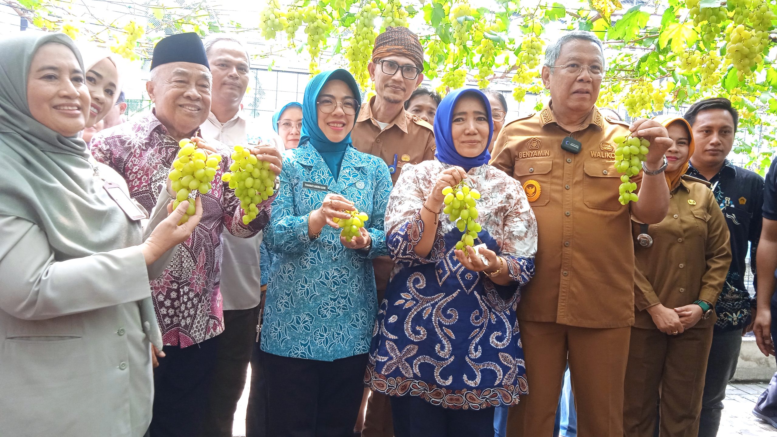 Ketua TP PKK Provinsi Banten Tinawati Andra Soni menyampaikan secara langsung kepada awak media online MDI. NEWS bahwa Panen perdana Buah Anggur Varietas PONJAY BENDAV Tentunya ini bisa menjadi destinasti wisata khususnya wisata buah anggur walaupun di tanam di lahan yang sempit dan kita juga bisa dapat impact dari benefitnya salah satunya yaitu visual yang bisa membuat senang di pekarangan ada sebuah lingkungan tanaman buah anggur khususnya di Tangerang selatan .